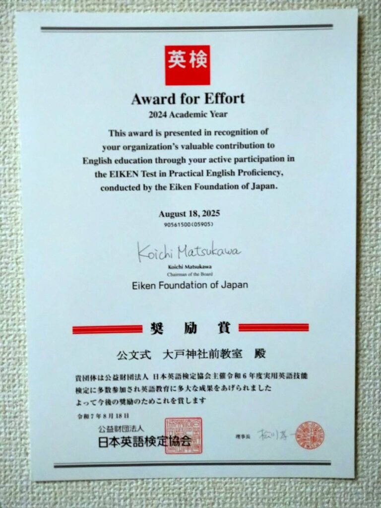 このたび、公文式大戸神社前教室は、公益財団法人 日本英語検定協会より